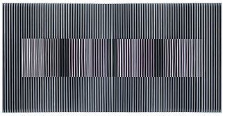 对于两位艺术家,我们还发现,除了精确的垂直方向外,还有略微倾斜放置在图片表面上的颜色条纹,在这两种情况下,这些条纹都可以将确切的垂直修改为波浪形: 由于使用了木条,这些波浪在诺瓦茨基更具棱角,而在莱利,它们以柔和的曲线弯曲。这些波浪形条纹排列在浮雕表面,给人以柔和过渡的印象——sfumato,它像面纱一样,覆盖在一排排条带的严格节奏上,支撑它们并陶醉眼睛。随着基本结构的所有形式上的严格和重复,第二个光学顺序开始发挥作用,它处理相同的图形元素,但仅从垂直轴最小地移动它们的方向。这种几乎察觉不到的与垂直方案的偏差的多次重复,以更柔和的旋律支撑了垂直渐变的严格节奏.