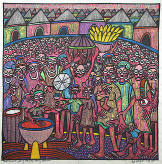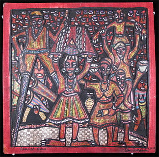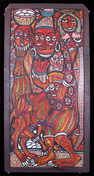Twins Seven-Seven在他开始艺术家职业生涯之前是一名巡回歌手和舞者,1964年首次参加由Ulli Beier和Georgina Beier在奥索博举办的Mbari Mbayo研讨会, 尼日利亚西南部的约鲁巴小镇。他后来成为奥索博学派最著名的艺术家之一.
