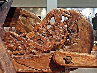木材无疑是维京艺术家的首选材料,在北欧相对容易雕刻,价格低廉且丰富。木材作为艺术媒介的重要性在维京时期的开始和结束时偶然幸存下来,即9世纪初的Oseberg船葬雕刻和12世纪乌尔内斯木板教堂的雕刻装饰。正如詹姆斯·格雷厄姆-坎贝尔(James Graham-Campbell)总结的那样:“这些非凡的幸存物至少让我们对维京艺术的原始语料库所缺少的东西形成了印象,尽管木制碎片和其他材料(如鹿角、琥珀和海象象牙)的小规模雕刻提供了进一步的暗示。纺织艺术也不可避免地也是如此,尽管编织和刺绣显然是发达的工艺。
