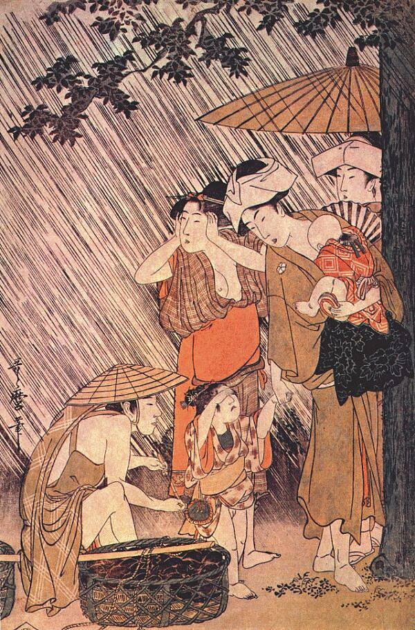 《淋浴》是歌麿在1790年代创作的一幅大型木版画,属于他的《十二种时髦之色》系列之一。这幅画描绘了一位妓女在浴室里洗澡的场景,她身穿一件薄纱的浴衣,正用一只木桶浇水在自己的头上。她的身体被水打湿,透过浴衣可以看到她的曲线。她的头发被一条白色的布带束起,露出了额头和耳朵。她的眼睛微微闭着,嘴角带着一丝笑意,似乎在享受着清凉的水流。