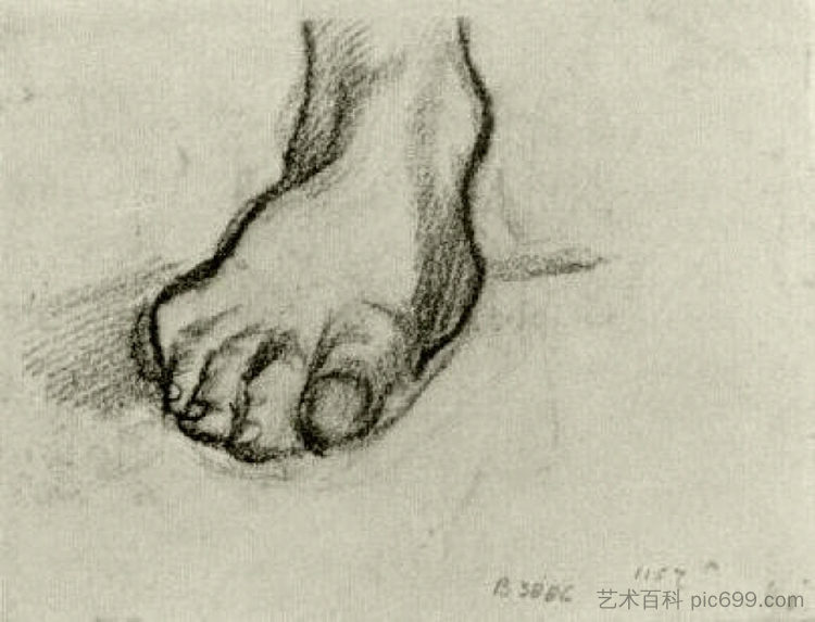 《一只脚的草图》是文森特·梵高于1886年在安特卫普创作的一幅素描作品,使用了黑色粉笔和纸张。这幅画是梵高在安特卫普美术学院学习时的练习之一,他在那里接受了传统的素描训练,学习了人体解剖学和比例。梵高在这幅画中展示了他对脚部结构和细节的观察,以及对光影和形态的把握。