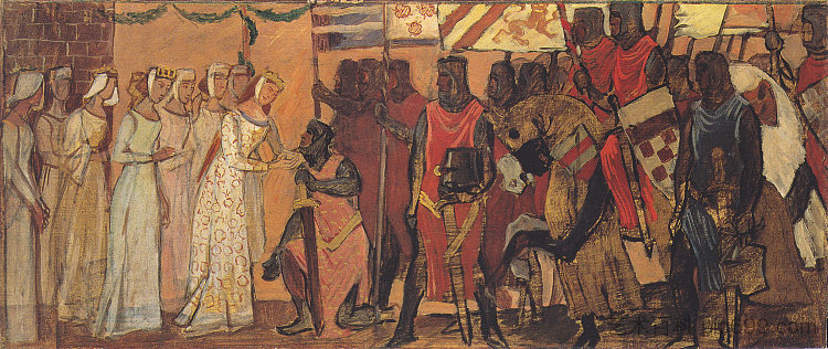 埃策尔国王进入维也纳(第二稿) Einzug König Etzels in Wien (zweiter Entwurf) (1908),阿尔宾·艾格·利恩茨 阿尔宾·艾格·利恩茨 历史画、新艺术运动、油画、画布、表现主义 作品名称:埃策尔国王进入维也纳(第二稿) Einzug König Etzels in Wien (zweiter Entwurf) 创作者:阿尔宾·艾格·利恩茨 Albin Egger-Lienz 创作年代:1908 风格:表现主义,新艺术运动 媒材:画布,油画 类型:历史画 版权信息:Public domain 感谢您对艺术百科网站的运营支持,您的赞助属于自愿行为,用于支付本站服务器资源和运营维护成本。 高清原图下载地址: 下载地址:https://oss.pic699.com/albin-egger-lienz/egger-lienz-einzug-k-nig-etzels-in-wien-zweiter-entwurf-1908.jpeg 无水印原图下载当前图片下载价格1 元请先登录阿尔宾·艾格·利恩茨 作品合集(共57张)下载价格7.9 元请先登录客服QQ:4216683 0 0 中世纪历史纺织