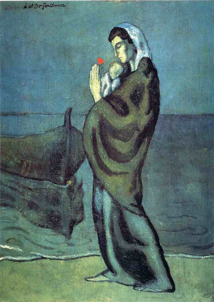 这幅画是毕加索于1902年创作的,属于他的“蓝色时期”的代表作之一。这一时期的毕加索受到了好友卡萨赫马斯的自杀和巴黎贫民窟生活的影响,画风显得忧郁而沉重,色调以蓝色为主,表现了社会底层人民的悲惨命运和孤独无助的心情。