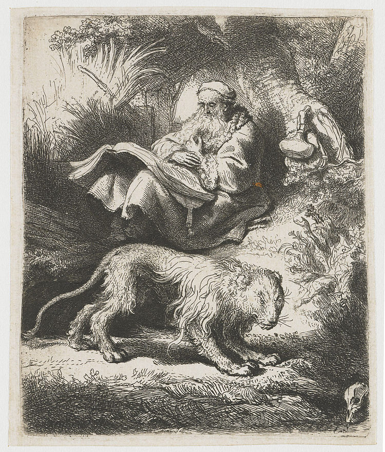 《圣杰罗姆阅读》是伦勃朗在1634年创作的一幅铜版画,描绘了基督教教父之一圣杰罗姆在一座意大利式风景中沉浸在书本中的场景。圣杰罗姆是一位学者和翻译家,他将《圣经》从希伯来文和希腊文翻译成拉丁文,被认为是西方文化的奠基人之一。他通常被描绘为一个隐士,与他的象征物——一只狮子和一顶红色帽子——相伴。