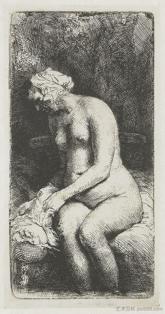 这幅描绘一位坐着的裸体女人的版画是伦勃朗在1658年创作的几幅女性裸体版画之一,这些作品都是根据真实的模特直接素描而成的。这些作品都暗示了一种场景或主题,但艺术家无疑是希望它们能够开放给观者自由解读。在这幅作品中,伦勃朗没有画出女人的脚,这表明他想让她们悬在水中;在黑暗的背景中,可以看到几簇树叶。然而,他也画了一个大垫子和一个像是椅子靠背的东西。这些细节增加了作品的神秘感和诗意。