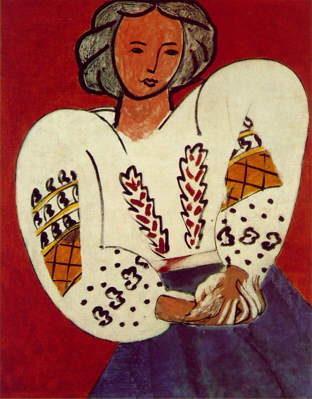 马蒂斯对罗马尼亚服饰的兴趣始于1939年,当时他在巴黎看到了一场展览,展出了来自巴尔干地区的民族服装。他被其中一件罗马尼亚衬衫所吸引,便买下了它,并让他的模特穿上它。他对这件衣服进行了多次创作,每次都在简化和凝缩形式和色彩,直到达到这幅画作的效果。他还拍摄了创作过程中的照片,并在画廊展出,展示了他对线条和色彩融合的追求。