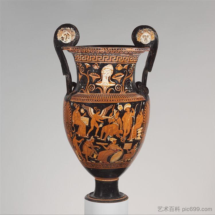 反面:奈斯科斯与已故妇女的雕像,手持花圈、长腰带和一朵花。奈斯科斯周围有四个哀悼者。上方,两边是一个坐着的青年,手里拿着一个盒子;左边的那个也放着葡萄。另一个,一个司徒劳。下面,也是对称排列的,一个女人从八边走近,拿着一面镜子和一个oinochoe。在浮雕的手柄上,黑发的艾欧的头。