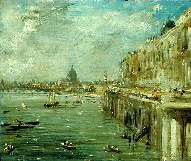 作品名称:萨默塞特宫露台和泰晤士河 从滑铁卢桥北端眺望,远处是圣保罗大教堂 Somerset House Terrace and the Thames A View from the North End of Waterloo Bridge with St. Paul’s Cathedral in the distance