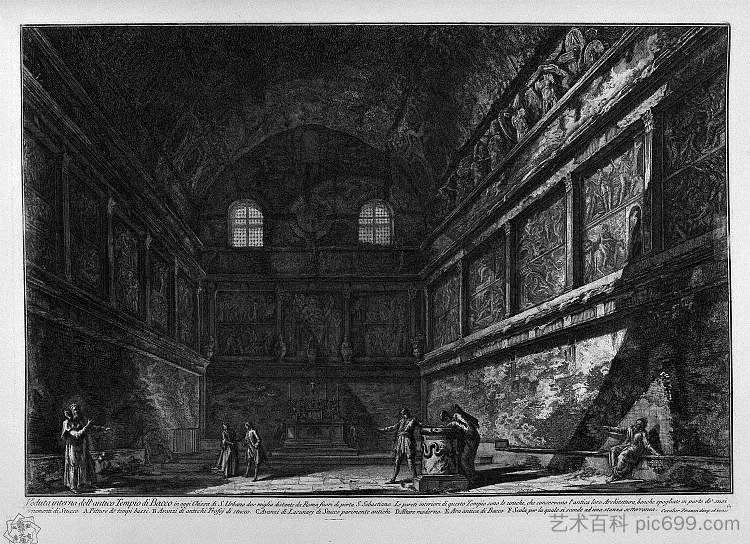 皮拉内西用精湛的技巧和细节表现了神庙内部的结构和装饰,以及教堂的祭坛和壁画。他运用了强烈的光影对比和透视效果,创造了一种深邃而神秘的氛围。他还在画面中加入了一些人物,增加了生动性和尺度感。他的画作不仅展示了古罗马建筑的风貌和历史,也体现了他对古典文化的敬意和想象力。