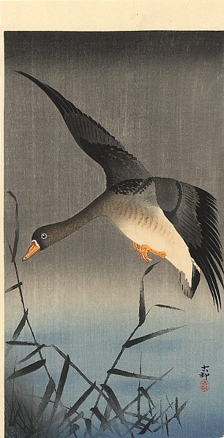 白额鹅在芦苇丛中降落 White-fronted goose descending over reeds,小原古邨
