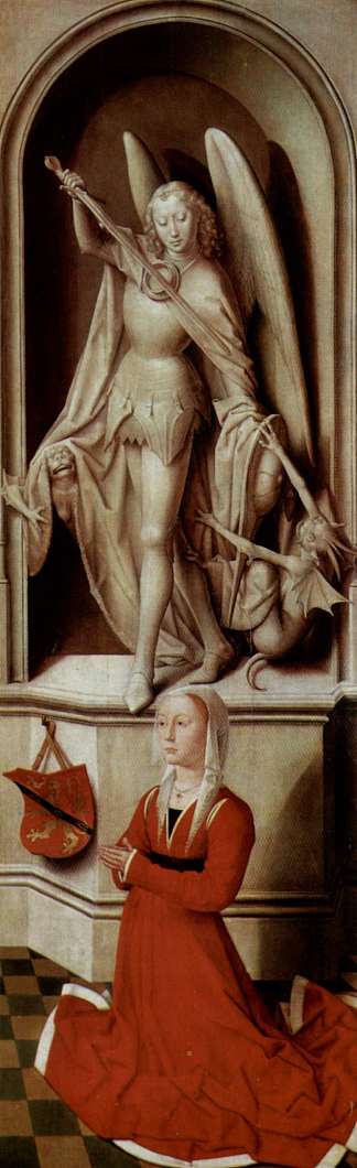 《最后的审判》三联画,右翼,祈祷捐赠者凯瑟琳·塔纳格利与大天使米迦勒 The Last Judgment triptych, right wing, Praying donor Catherine Tanagli with archangel Michael (1467 – 1471),汉斯·梅姆林